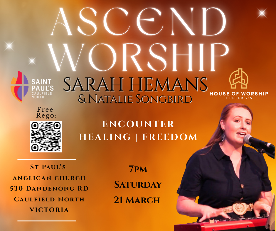 7pm Saturday, 21 March at St Paul’s. 530 Dandenong Rd, Caulfield North